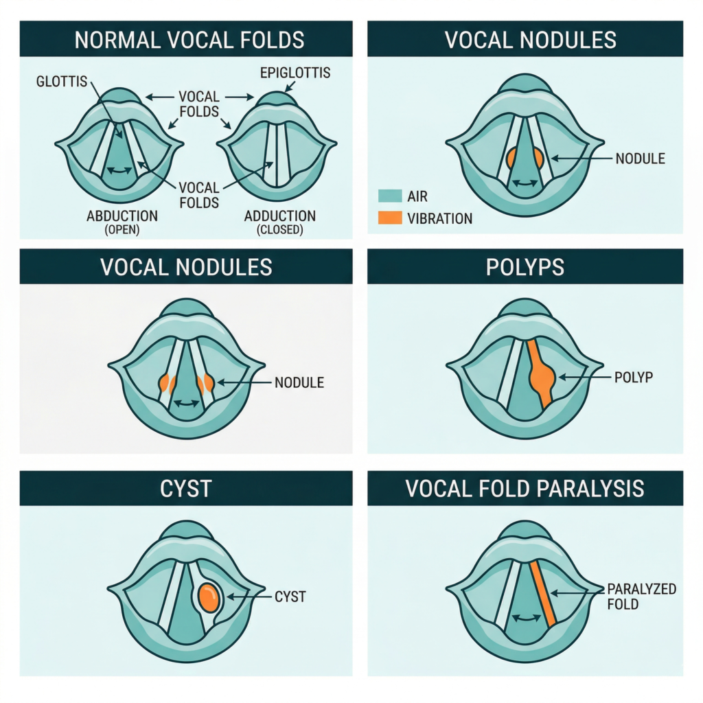 Laryngology covers a wide range of conditions affecting the voice and throat, including: