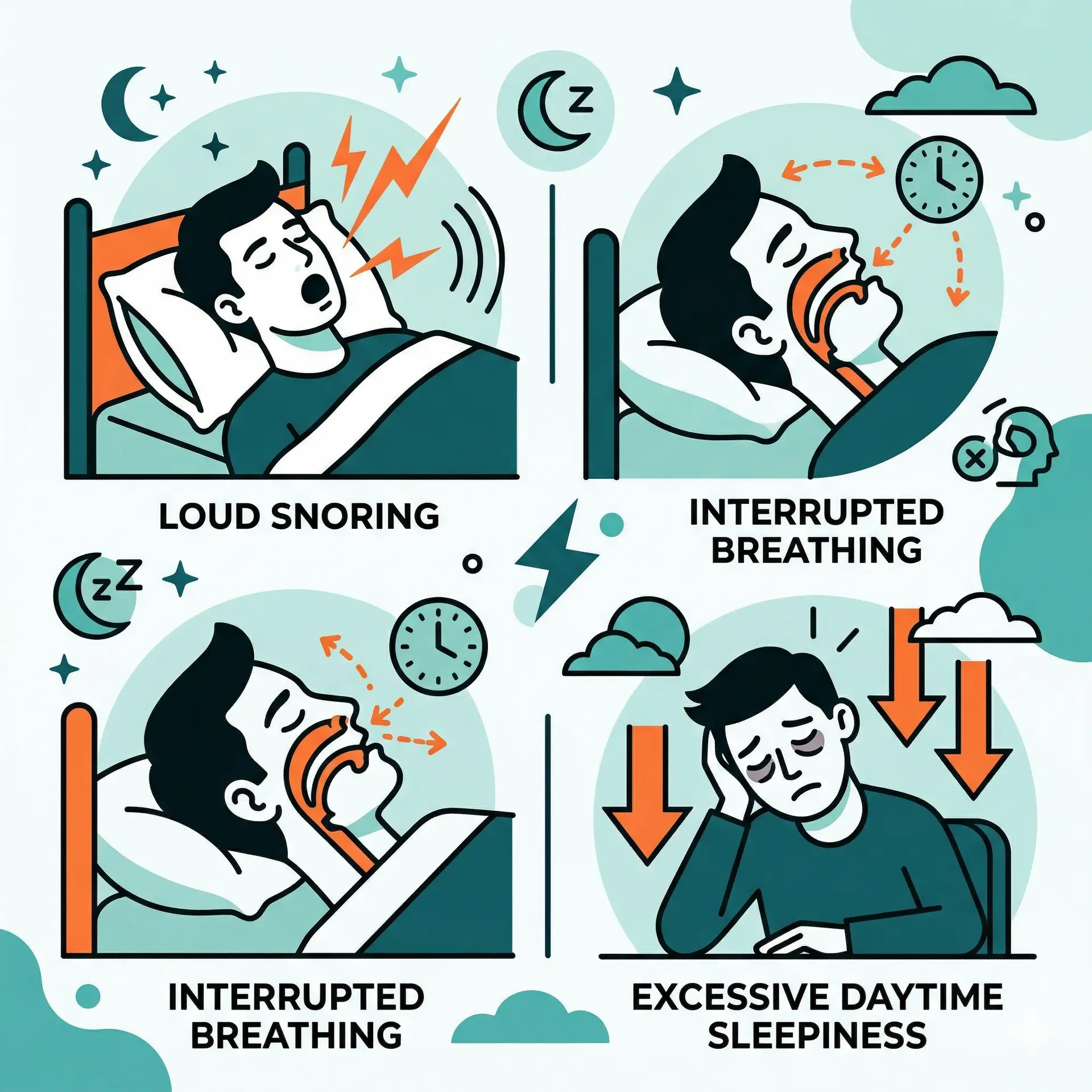 Snoring is a sound caused by airway vibration, while sleep apnea is a medical condition involving breathing pauses during sleep, including: