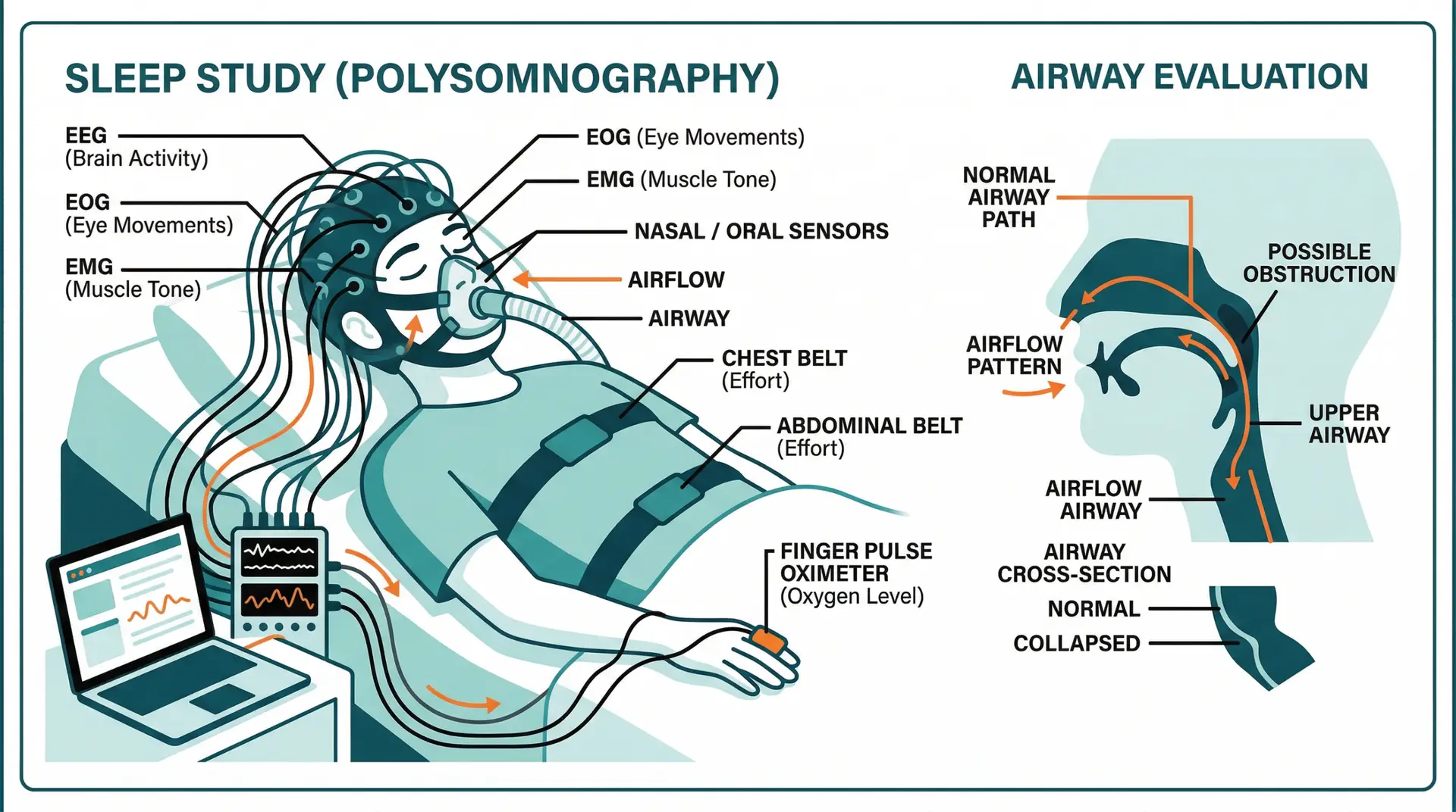A comprehensive assessment is required to diagnose sleep apnea accurately. This often includes a sleep study (polysomnography), which monitors breathing patterns, oxygen levels, and sleep stages throughout the night. Clinical examination of the nose, throat, and airway helps identify structural causes of obstruction. In some cases, imaging or endoscopic evaluation may be performed to further assess airway anatomy and pinpoint the site of blockage.